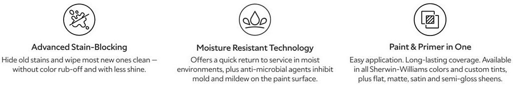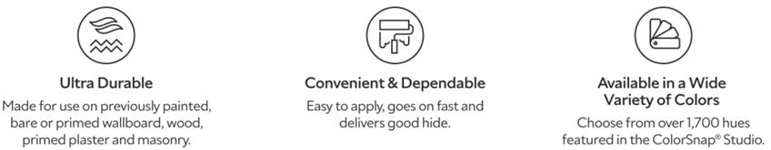 - Expected Benefits: Excellent coverage and hide. It has great “flow and leveling,” which means it smooths out as it dries to help minimize the appearance of brush and roller marks. It also provides a durable, washable finish that holds up well over time.